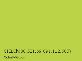 CIELCh 80.521,69.091,112.603 Color is a normal yellow color and the nearest color is June Bud #bdda57. Hex code #bbd347 and RGB value is rgb(187,211,71). In RGB color space, this color is composed of 73% red, 83% green, 28% blue, In CMYK color space, this color is composed of 11% cyan, 0% magenta, 66% yellow , 17% black , In HSL color space, this color has a hue angle of 70° , 61% saturation and 55% lightness.