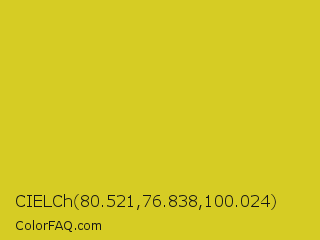 CIELCh 80.521,76.838,100.024 Color is a normal yellow color and the nearest color is Bird Flower #d4cd16. Hex code #d6cc24 and RGB value is rgb(214,204,36). In RGB color space, this color is composed of 84% red, 80% green, 14% blue, In CMYK color space, this color is composed of 0% cyan, 5% magenta, 83% yellow , 16% black , In HSL color space, this color has a hue angle of 57° , 71% saturation and 49% lightness.