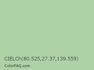 CIELCh 80.525,27.37,139.559 Color is a light green color and the nearest color is Spring Rain #accbb1. Hex code #acd2a6 and RGB value is rgb(172,210,166). In RGB color space, this color is composed of 67% red, 82% green, 65% blue, In CMYK color space, this color is composed of 18% cyan, 0% magenta, 21% yellow , 18% black , In HSL color space, this color has a hue angle of 112° , 33% saturation and 74% lightness.