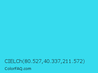 CIELCh 80.527,40.337,211.572 Color is a normal cyan color and the nearest color is Turquoise #40e0d0. Hex code #36dbee and RGB value is rgb(54,219,238). In RGB color space, this color is composed of 21% red, 86% green, 93% blue, In CMYK color space, this color is composed of 77% cyan, 8% magenta, 0% yellow , 7% black , In HSL color space, this color has a hue angle of 186° , 84% saturation and 57% lightness.