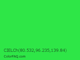 CIELCh 80.532,96.235,139.84 Color is a normal green color and the nearest color is Lime Green #32cd32. Hex code #2ee647 and RGB value is rgb(46,230,71). In RGB color space, this color is composed of 18% red, 90% green, 28% blue, In CMYK color space, this color is composed of 80% cyan, 0% magenta, 69% yellow , 10% black , In HSL color space, this color has a hue angle of 128° , 79% saturation and 54% lightness.