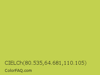 CIELCh 80.535,64.681,110.105 Color is a normal yellow color and the nearest color is June Bud #bdda57. Hex code #c2d14f and RGB value is rgb(194,209,79). In RGB color space, this color is composed of 76% red, 82% green, 31% blue, In CMYK color space, this color is composed of 7% cyan, 0% magenta, 62% yellow , 18% black , In HSL color space, this color has a hue angle of 67° , 59% saturation and 56% lightness.