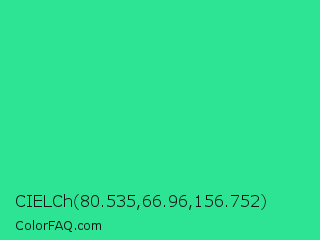 CIELCh 80.535,66.96,156.752 Color is a normal green color and the nearest color is Shamrock #33cc99. Hex code #2de394 and RGB value is rgb(45,227,148). In RGB color space, this color is composed of 18% red, 89% green, 58% blue, In CMYK color space, this color is composed of 80% cyan, 0% magenta, 35% yellow , 11% black , In HSL color space, this color has a hue angle of 154° , 76% saturation and 53% lightness.