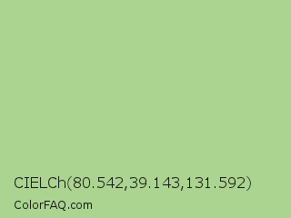 CIELCh 80.542,39.143,131.592 Color is a light green color and the nearest color is Feijoa #9fdd8c. Hex code #aad490 and RGB value is rgb(170,212,144). In RGB color space, this color is composed of 67% red, 83% green, 56% blue, In CMYK color space, this color is composed of 20% cyan, 0% magenta, 32% yellow , 17% black , In HSL color space, this color has a hue angle of 97° , 44% saturation and 70% lightness.