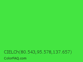 CIELCh 80.543,95.578,137.657 Color is a normal green color and the nearest color is Lime Green #32cd32. Hex code #44e541 and RGB value is rgb(68,229,65). In RGB color space, this color is composed of 27% red, 90% green, 25% blue, In CMYK color space, this color is composed of 70% cyan, 0% magenta, 72% yellow , 10% black , In HSL color space, this color has a hue angle of 119° , 76% saturation and 58% lightness.