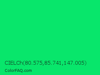 CIELCh 80.575,85.741,147.005 Color is a normal green color and the nearest color is Malachite #0bda51. Hex code #08e66b and RGB value is rgb(8,230,107). In RGB color space, this color is composed of 3% red, 90% green, 42% blue, In CMYK color space, this color is composed of 97% cyan, 0% magenta, 53% yellow , 10% black , In HSL color space, this color has a hue angle of 147° , 93% saturation and 47% lightness.
