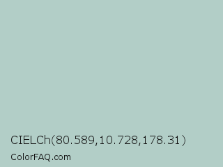 CIELCh 80.589,10.728,178.31 Color is a light cyan color and the nearest color is Jet Stream #b5d2ce. Hex code #b2cec7 and RGB value is rgb(178,206,199). In RGB color space, this color is composed of 70% red, 81% green, 78% blue, In CMYK color space, this color is composed of 14% cyan, 0% magenta, 3% yellow , 19% black , In HSL color space, this color has a hue angle of 165° , 22% saturation and 75% lightness.