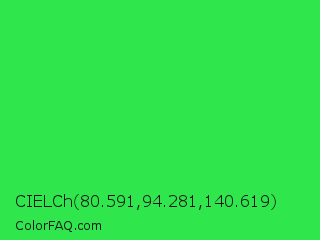 CIELCh 80.591,94.281,140.619 Color is a normal green color and the nearest color is Lime Green #32cd32. Hex code #2fe64d and RGB value is rgb(47,230,77). In RGB color space, this color is composed of 18% red, 90% green, 30% blue, In CMYK color space, this color is composed of 80% cyan, 0% magenta, 67% yellow , 10% black , In HSL color space, this color has a hue angle of 130° , 79% saturation and 54% lightness.