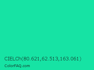 CIELCh 80.621,62.513,163.061 Color is a normal green color and the nearest color is Medium Spring Green #00fa9a. Hex code #16e3a4 and RGB value is rgb(22,227,164). In RGB color space, this color is composed of 9% red, 89% green, 64% blue, In CMYK color space, this color is composed of 90% cyan, 0% magenta, 28% yellow , 11% black , In HSL color space, this color has a hue angle of 162° , 82% saturation and 49% lightness.