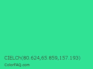 CIELCh 80.624,65.859,157.193 Color is a normal green color and the nearest color is Shamrock #33cc99. Hex code #31e396 and RGB value is rgb(49,227,150). In RGB color space, this color is composed of 19% red, 89% green, 59% blue, In CMYK color space, this color is composed of 78% cyan, 0% magenta, 34% yellow , 11% black , In HSL color space, this color has a hue angle of 154° , 76% saturation and 54% lightness.