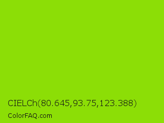 CIELCh 80.645,93.75,123.388 Color is a normal green color and the nearest color is Alien Armpit #84de02. Hex code #8cde06 and RGB value is rgb(140,222,6). In RGB color space, this color is composed of 55% red, 87% green, 2% blue, In CMYK color space, this color is composed of 37% cyan, 0% magenta, 97% yellow , 13% black , In HSL color space, this color has a hue angle of 83° , 95% saturation and 45% lightness.