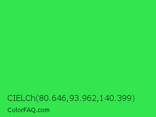 CIELCh 80.646,93.962,140.399 Color is a normal green color and the nearest color is Lime Green #32cd32. Hex code #33e64d and RGB value is rgb(51,230,77). In RGB color space, this color is composed of 20% red, 90% green, 30% blue, In CMYK color space, this color is composed of 78% cyan, 0% magenta, 67% yellow , 10% black , In HSL color space, this color has a hue angle of 129° , 78% saturation and 55% lightness.