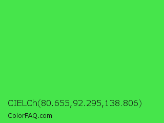 CIELCh 80.655,92.295,138.806 Color is a normal green color and the nearest color is Lime Green #32cd32. Hex code #46e54b and RGB value is rgb(70,229,75). In RGB color space, this color is composed of 27% red, 90% green, 29% blue, In CMYK color space, this color is composed of 69% cyan, 0% magenta, 67% yellow , 10% black , In HSL color space, this color has a hue angle of 122° , 75% saturation and 59% lightness.