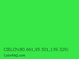 CIELCh 80.661,95.501,139.329 Color is a normal green color and the nearest color is Lime Green #32cd32. Hex code #37e647 and RGB value is rgb(55,230,71). In RGB color space, this color is composed of 22% red, 90% green, 28% blue, In CMYK color space, this color is composed of 76% cyan, 0% magenta, 69% yellow , 10% black , In HSL color space, this color has a hue angle of 125° , 78% saturation and 56% lightness.