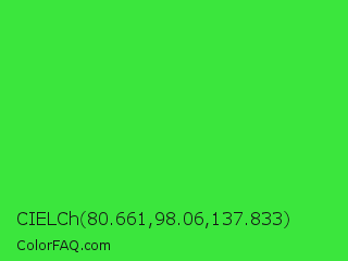 CIELCh 80.661,98.06,137.833 Color is a normal green color and the nearest color is Lime Green #32cd32. Hex code #3be63d and RGB value is rgb(59,230,61). In RGB color space, this color is composed of 23% red, 90% green, 24% blue, In CMYK color space, this color is composed of 74% cyan, 0% magenta, 73% yellow , 10% black , In HSL color space, this color has a hue angle of 121° , 77% saturation and 57% lightness.