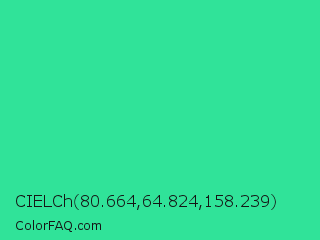 CIELCh 80.664,64.824,158.239 Color is a normal green color and the nearest color is Shamrock #33cc99. Hex code #30e399 and RGB value is rgb(48,227,153). In RGB color space, this color is composed of 19% red, 89% green, 60% blue, In CMYK color space, this color is composed of 79% cyan, 0% magenta, 33% yellow , 11% black , In HSL color space, this color has a hue angle of 155° , 76% saturation and 54% lightness.