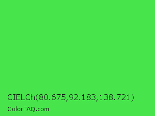 CIELCh 80.675,92.183,138.721 Color is a normal green color and the nearest color is Lime Green #32cd32. Hex code #47e54b and RGB value is rgb(71,229,75). In RGB color space, this color is composed of 28% red, 90% green, 29% blue, In CMYK color space, this color is composed of 69% cyan, 0% magenta, 67% yellow , 10% black , In HSL color space, this color has a hue angle of 122° , 75% saturation and 59% lightness.