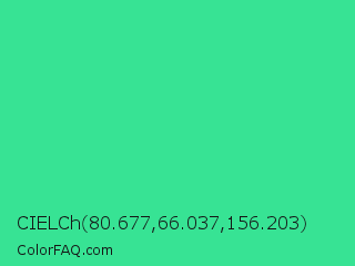 CIELCh 80.677,66.037,156.203 Color is a normal green color and the nearest color is Shamrock #33cc99. Hex code #37e394 and RGB value is rgb(55,227,148). In RGB color space, this color is composed of 22% red, 89% green, 58% blue, In CMYK color space, this color is composed of 76% cyan, 0% magenta, 35% yellow , 11% black , In HSL color space, this color has a hue angle of 152° , 75% saturation and 55% lightness.