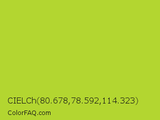 CIELCh 80.678,78.592,114.323 Color is a normal lime color and the nearest color is Key Lime Pie #bfc921. Hex code #b3d630 and RGB value is rgb(179,214,48). In RGB color space, this color is composed of 70% red, 84% green, 19% blue, In CMYK color space, this color is composed of 16% cyan, 0% magenta, 78% yellow , 16% black , In HSL color space, this color has a hue angle of 73° , 67% saturation and 51% lightness.