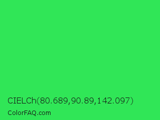 CIELCh 80.689,90.89,142.097 Color is a normal green color and the nearest color is UFO Green #3cd070. Hex code #30e657 and RGB value is rgb(48,230,87). In RGB color space, this color is composed of 19% red, 90% green, 34% blue, In CMYK color space, this color is composed of 79% cyan, 0% magenta, 62% yellow , 10% black , In HSL color space, this color has a hue angle of 133° , 78% saturation and 55% lightness.