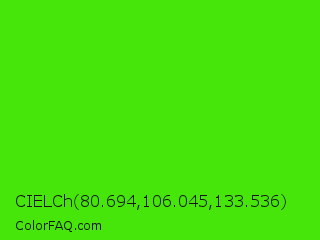 CIELCh 80.694,106.045,133.536 Color is a normal green color and the nearest color is Chlorophyll Green #4aff00. Hex code #46e60b and RGB value is rgb(70,230,11). In RGB color space, this color is composed of 27% red, 90% green, 4% blue, In CMYK color space, this color is composed of 70% cyan, 0% magenta, 95% yellow , 10% black , In HSL color space, this color has a hue angle of 104° , 91% saturation and 47% lightness.