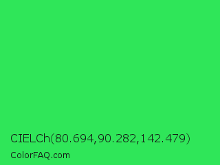 CIELCh 80.694,90.282,142.479 Color is a normal green color and the nearest color is UFO Green #3cd070. Hex code #2fe659 and RGB value is rgb(47,230,89). In RGB color space, this color is composed of 18% red, 90% green, 35% blue, In CMYK color space, this color is composed of 80% cyan, 0% magenta, 61% yellow , 10% black , In HSL color space, this color has a hue angle of 134° , 79% saturation and 54% lightness.