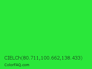 CIELCh 80.711,100.662,138.433 Color is a normal green color and the nearest color is Lime Green #32cd32. Hex code #2ae73a and RGB value is rgb(42,231,58). In RGB color space, this color is composed of 16% red, 91% green, 23% blue, In CMYK color space, this color is composed of 82% cyan, 0% magenta, 75% yellow , 9% black , In HSL color space, this color has a hue angle of 125° , 80% saturation and 54% lightness.