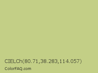CIELCh 80.71,38.283,114.057 Color is a light yellow color and the nearest color is Pine Glade #c7cd90. Hex code #c3cf86 and RGB value is rgb(195,207,134). In RGB color space, this color is composed of 76% red, 81% green, 53% blue, In CMYK color space, this color is composed of 6% cyan, 0% magenta, 35% yellow , 19% black , In HSL color space, this color has a hue angle of 70° , 43% saturation and 67% lightness.