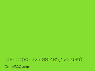 CIELCh 80.725,88.485,126.939 Color is a normal green color and the nearest color is Kiwi #8ee53f. Hex code #85df30 and RGB value is rgb(133,223,48). In RGB color space, this color is composed of 52% red, 87% green, 19% blue, In CMYK color space, this color is composed of 40% cyan, 0% magenta, 78% yellow , 13% black , In HSL color space, this color has a hue angle of 91° , 73% saturation and 53% lightness.