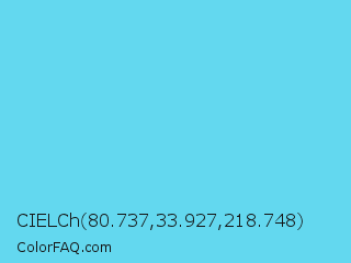 CIELCh 80.737,33.927,218.748 Color is a light cyan color and the nearest color is Turquoise Blue #6cdae7. Hex code #63d8ef and RGB value is rgb(99,216,239). In RGB color space, this color is composed of 39% red, 85% green, 94% blue, In CMYK color space, this color is composed of 59% cyan, 10% magenta, 0% yellow , 6% black , In HSL color space, this color has a hue angle of 190° , 81% saturation and 66% lightness.