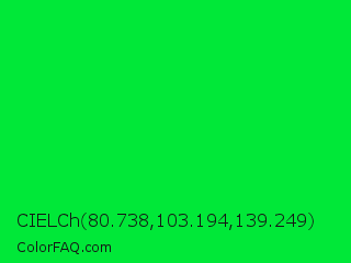 CIELCh 80.738,103.194,139.249 Color is a normal green color and the nearest color is Vivid Malachite #00cc33. Hex code #00e838 and RGB value is rgb(0,232,56). In RGB color space, this color is composed of 0% red, 91% green, 22% blue, In CMYK color space, this color is composed of 100% cyan, 0% magenta, 76% yellow , 9% black , In HSL color space, this color has a hue angle of 134° , 100% saturation and 45% lightness.