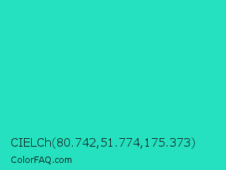 CIELCh 80.742,51.774,175.373 Color is a normal cyan color and the nearest color is Turquoise PWG #30d5c8. Hex code #25e1bf and RGB value is rgb(37,225,191). In RGB color space, this color is composed of 15% red, 88% green, 75% blue, In CMYK color space, this color is composed of 84% cyan, 0% magenta, 15% yellow , 12% black , In HSL color space, this color has a hue angle of 169° , 76% saturation and 51% lightness.