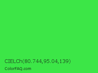 CIELCh 80.744,95.04,139 Color is a normal green color and the nearest color is Lime Green #32cd32. Hex code #3ce647 and RGB value is rgb(60,230,71). In RGB color space, this color is composed of 24% red, 90% green, 28% blue, In CMYK color space, this color is composed of 74% cyan, 0% magenta, 69% yellow , 10% black , In HSL color space, this color has a hue angle of 124° , 77% saturation and 57% lightness.