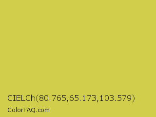 CIELCh 80.765,65.173,103.579 Color is a normal yellow color and the nearest color is Wattle #dcd747. Hex code #d0ce4a and RGB value is rgb(208,206,74). In RGB color space, this color is composed of 82% red, 81% green, 29% blue, In CMYK color space, this color is composed of 0% cyan, 1% magenta, 64% yellow , 18% black , In HSL color space, this color has a hue angle of 59° , 59% saturation and 55% lightness.