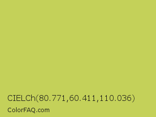 CIELCh 80.771,60.411,110.036 Color is a normal yellow color and the nearest color is June Bud #bdda57. Hex code #c4d159 and RGB value is rgb(196,209,89). In RGB color space, this color is composed of 77% red, 82% green, 35% blue, In CMYK color space, this color is composed of 6% cyan, 0% magenta, 57% yellow , 18% black , In HSL color space, this color has a hue angle of 67° , 57% saturation and 58% lightness.