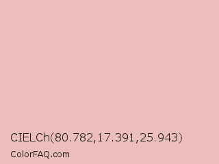 CIELCh 80.782,17.391,25.943 Color is a very light red color and the nearest color is Beauty Bush #eec1be. Hex code #ebbebb and RGB value is rgb(235,190,187). In RGB color space, this color is composed of 92% red, 75% green, 73% blue, In CMYK color space, this color is composed of 0% cyan, 19% magenta, 20% yellow , 8% black , In HSL color space, this color has a hue angle of 4° , 55% saturation and 83% lightness.