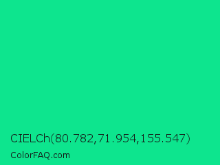 CIELCh 80.782,71.954,155.547 Color is a normal green color and the nearest color is Medium Spring Green #00fa9a. Hex code #0de58e and RGB value is rgb(13,229,142). In RGB color space, this color is composed of 5% red, 90% green, 56% blue, In CMYK color space, this color is composed of 94% cyan, 0% magenta, 38% yellow , 10% black , In HSL color space, this color has a hue angle of 156° , 89% saturation and 47% lightness.