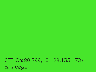 CIELCh 80.799,101.29,135.173 Color is a normal green color and the nearest color is Harlequin Green #46cb18. Hex code #47e62b and RGB value is rgb(71,230,43). In RGB color space, this color is composed of 28% red, 90% green, 17% blue, In CMYK color space, this color is composed of 69% cyan, 0% magenta, 81% yellow , 10% black , In HSL color space, this color has a hue angle of 111° , 79% saturation and 54% lightness.