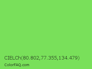 CIELCh 80.802,77.355,134.479 Color is a light green color and the nearest color is Pastel Green #77dd77. Hex code #79e05a and RGB value is rgb(121,224,90). In RGB color space, this color is composed of 47% red, 88% green, 35% blue, In CMYK color space, this color is composed of 46% cyan, 0% magenta, 60% yellow , 12% black , In HSL color space, this color has a hue angle of 106° , 68% saturation and 62% lightness.