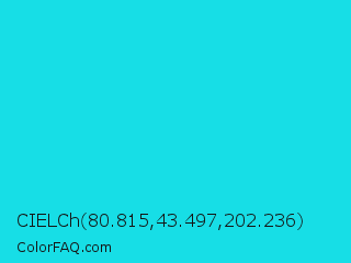 CIELCh 80.815,43.497,202.236 Color is a normal cyan color and the nearest color is Bright Turquoise #08e8de. Hex code #17dee6 and RGB value is rgb(23,222,230). In RGB color space, this color is composed of 9% red, 87% green, 90% blue, In CMYK color space, this color is composed of 90% cyan, 3% magenta, 0% yellow , 10% black , In HSL color space, this color has a hue angle of 182° , 82% saturation and 50% lightness.