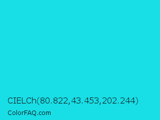 CIELCh 80.822,43.453,202.244 Color is a normal cyan color and the nearest color is Bright Turquoise #08e8de. Hex code #18dee6 and RGB value is rgb(24,222,230). In RGB color space, this color is composed of 9% red, 87% green, 90% blue, In CMYK color space, this color is composed of 90% cyan, 3% magenta, 0% yellow , 10% black , In HSL color space, this color has a hue angle of 182° , 81% saturation and 50% lightness.