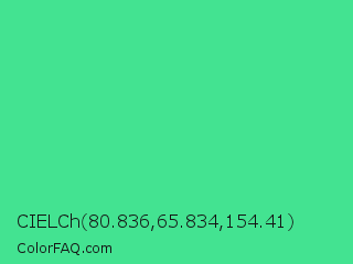 CIELCh 80.836,65.834,154.41 Color is a normal green color and the nearest color is Eucalyptus #44d7a8. Hex code #43e391 and RGB value is rgb(67,227,145). In RGB color space, this color is composed of 26% red, 89% green, 57% blue, In CMYK color space, this color is composed of 70% cyan, 0% magenta, 36% yellow , 11% black , In HSL color space, this color has a hue angle of 149° , 74% saturation and 58% lightness.