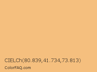 CIELCh 80.839,41.734,73.813 Color is a light orange color and the nearest color is Mellow Apricot #f8b878. Hex code #f5bf7e and RGB value is rgb(245,191,126). In RGB color space, this color is composed of 96% red, 75% green, 49% blue, In CMYK color space, this color is composed of 0% cyan, 22% magenta, 49% yellow , 4% black , In HSL color space, this color has a hue angle of 33° , 86% saturation and 73% lightness.