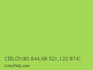 CIELCh 80.844,68.521,122.874 Color is a normal green color and the nearest color is Conifer #acdd4d. Hex code #a4d956 and RGB value is rgb(164,217,86). In RGB color space, this color is composed of 64% red, 85% green, 34% blue, In CMYK color space, this color is composed of 24% cyan, 0% magenta, 60% yellow , 15% black , In HSL color space, this color has a hue angle of 84° , 63% saturation and 59% lightness.