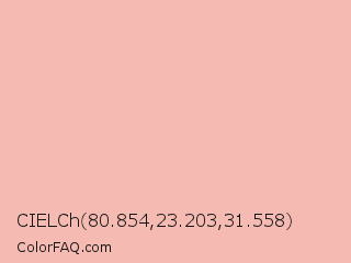 CIELCh 80.854,23.203,31.558 Color is a very light red color and the nearest color is Melon #fdbcb4. Hex code #f5bbb3 and RGB value is rgb(245,187,179). In RGB color space, this color is composed of 96% red, 73% green, 70% blue, In CMYK color space, this color is composed of 0% cyan, 24% magenta, 27% yellow , 4% black , In HSL color space, this color has a hue angle of 7° , 77% saturation and 83% lightness.