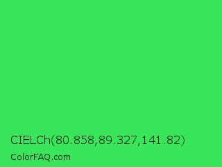 CIELCh 80.858,89.327,141.82 Color is a normal green color and the nearest color is UFO Green #3cd070. Hex code #3ae659 and RGB value is rgb(58,230,89). In RGB color space, this color is composed of 23% red, 90% green, 35% blue, In CMYK color space, this color is composed of 75% cyan, 0% magenta, 61% yellow , 10% black , In HSL color space, this color has a hue angle of 131° , 77% saturation and 56% lightness.