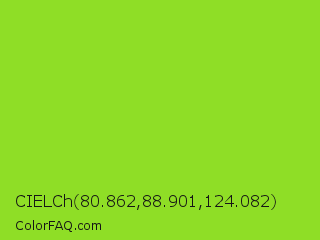 CIELCh 80.862,88.901,124.082 Color is a normal green color and the nearest color is Atlantis #97cd2d. Hex code #8fde26 and RGB value is rgb(143,222,38). In RGB color space, this color is composed of 56% red, 87% green, 15% blue, In CMYK color space, this color is composed of 36% cyan, 0% magenta, 83% yellow , 13% black , In HSL color space, this color has a hue angle of 86° , 74% saturation and 51% lightness.