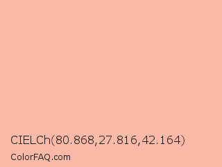 CIELCh 80.868,27.816,42.164 Color is a very light red color and the nearest color is Melon Crayola #febaad. Hex code #fabaa7 and RGB value is rgb(250,186,167). In RGB color space, this color is composed of 98% red, 73% green, 65% blue, In CMYK color space, this color is composed of 0% cyan, 26% magenta, 33% yellow , 2% black , In HSL color space, this color has a hue angle of 14° , 89% saturation and 82% lightness.