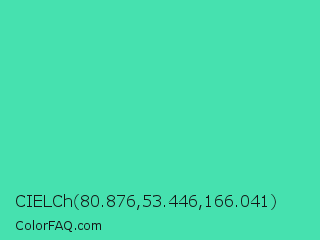 CIELCh 80.876,53.446,166.041 Color is a normal green color and the nearest color is Eucalyptus #44d7a8. Hex code #46e1af and RGB value is rgb(70,225,175). In RGB color space, this color is composed of 27% red, 88% green, 69% blue, In CMYK color space, this color is composed of 69% cyan, 0% magenta, 22% yellow , 12% black , In HSL color space, this color has a hue angle of 161° , 72% saturation and 58% lightness.