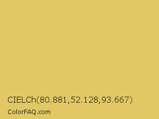 CIELCh 80.881,52.128,93.667 Color is a light yellow color and the nearest color is Chenin #dfcd6f. Hex code #e1c865 and RGB value is rgb(225,200,101). In RGB color space, this color is composed of 88% red, 78% green, 40% blue, In CMYK color space, this color is composed of 0% cyan, 11% magenta, 55% yellow , 12% black , In HSL color space, this color has a hue angle of 48° , 67% saturation and 64% lightness.